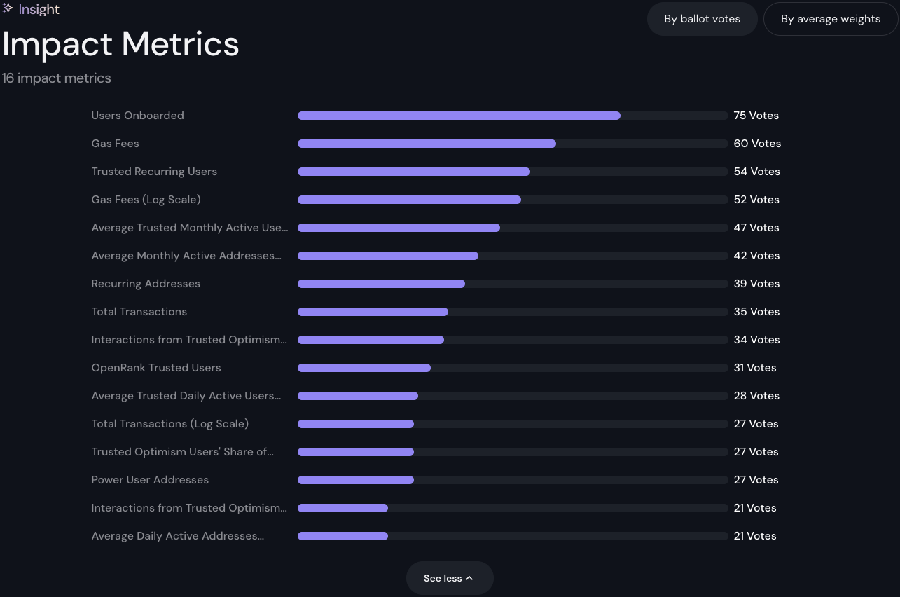 **Vote by Selecting and Weighting Metrics**: Badgeholders voted by selecting and assigning weights to various impact metrics. Each metric comes with a description and a link explaining its calculation.