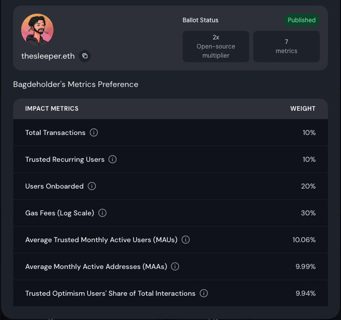 Displays the metrics selected by each badgeholder to evaluate projects, along with the weights assigned to each metric.